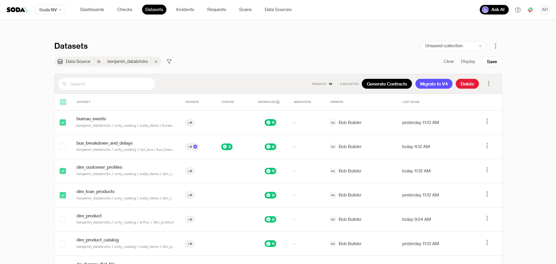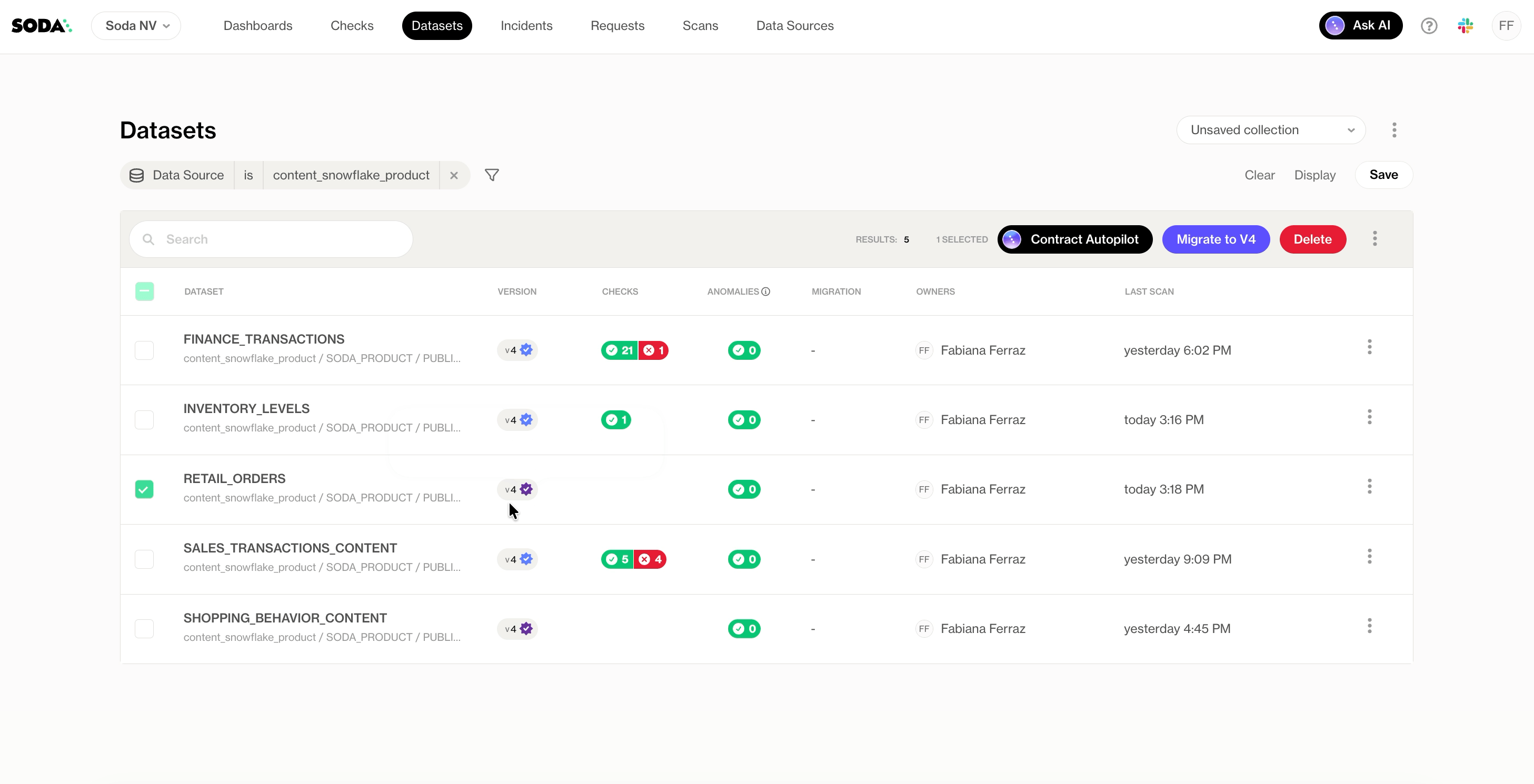 From the Datasets page in Soda Cloud, select the tables you want to cover. Autopilot only generates contracts for datasets that don't already have an existing contract, so there's no risk of overwriting work your team has already done.