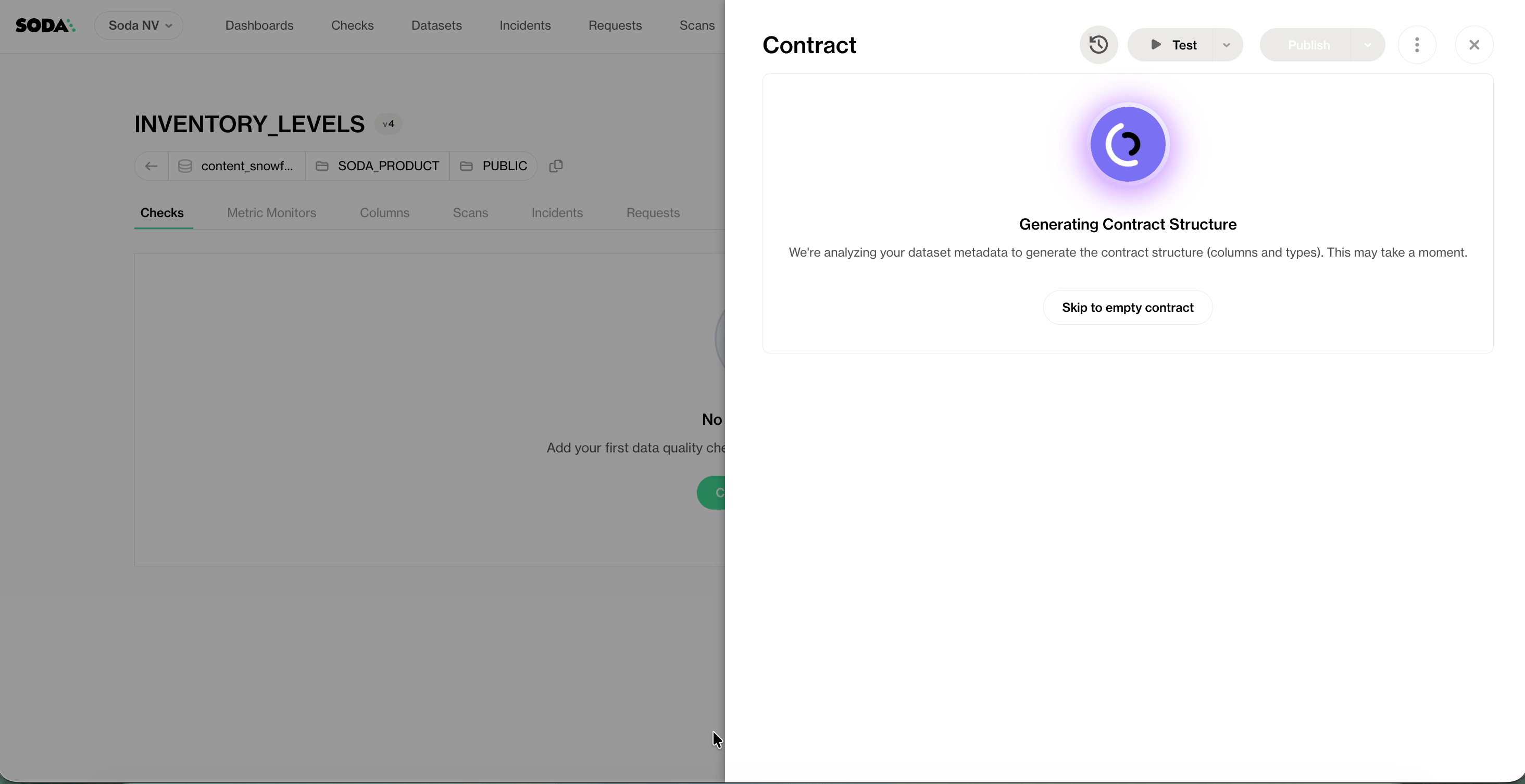 When you use Create Contract (or the CLI generate command), Soda produces a contract skeleton based on the dataset metadata, without analyzing the actual data. No checks, just columns and schema. It's a starting point for manual authoring.