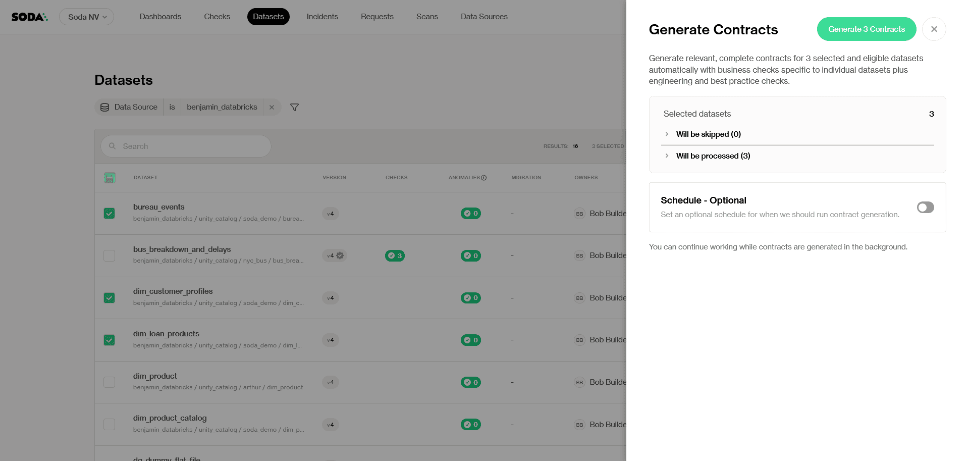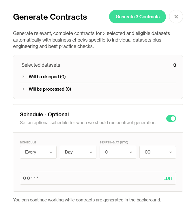 Before generation begins, Soda shows you a snapshot of which contracts will be created and a time estimate. You can continue using Soda Cloud while generation runs in the background.