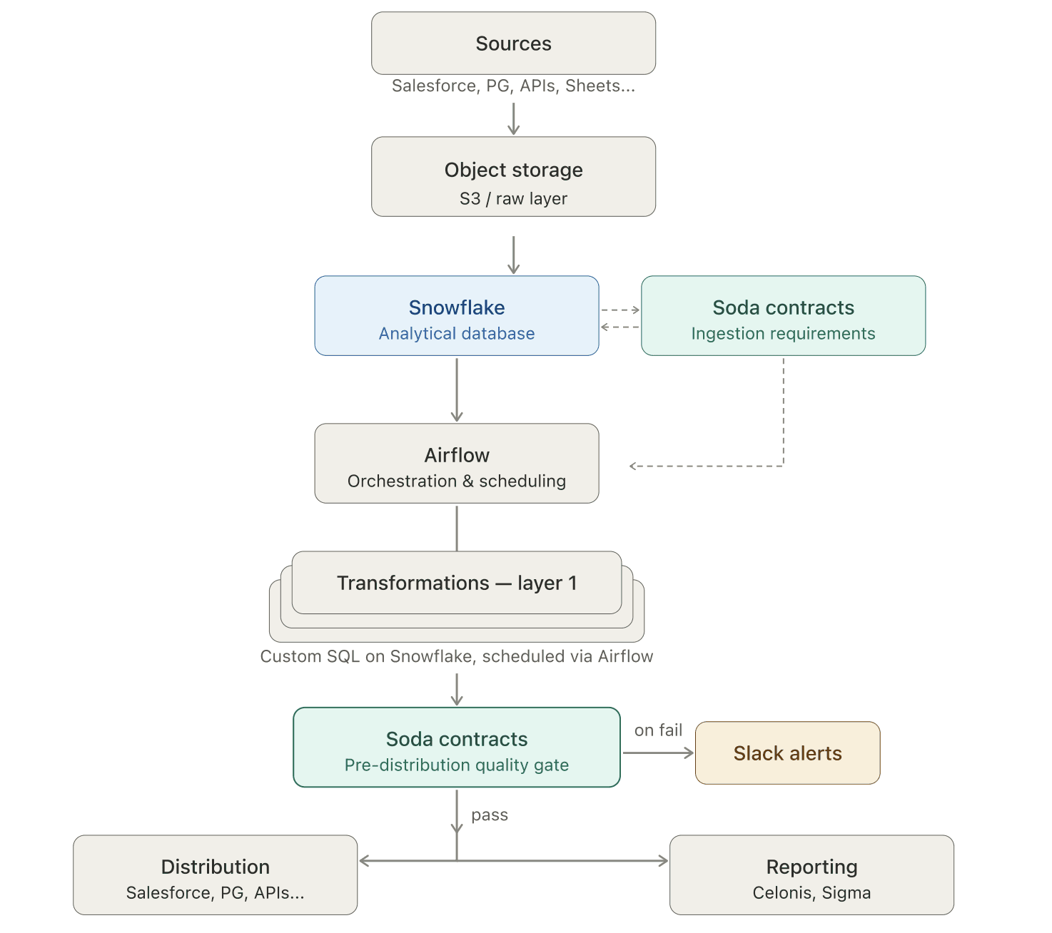 The most sensitive area was the monthly ARR reconciliation. Finance and Analytics consumed the same source data but regularly arrived at different numbers. Without automated checks embedded in the pipeline, errors traveled all the way downstream. Every fix started with a stakeholder notification, not a monitoring alert — pulling engineers off planned projects to investigate issues that had already made it into reports.
