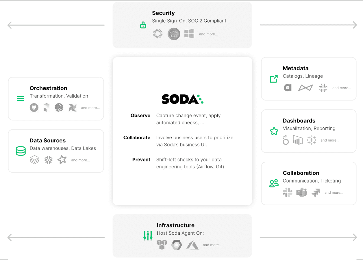 SodaCL checks run inside pipelines and integrate with orchestration and warehouse tools like Airflow, Dagster, Prefect, Snowflake, and Databricks.