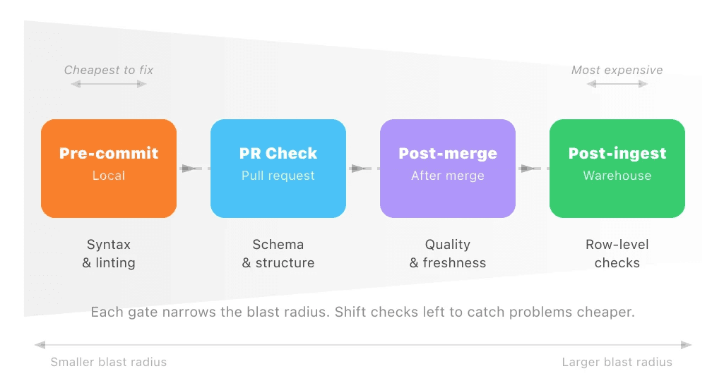 Each gate narrows the blast radius of a bad change. A malformed contract file gets caught before it ever reaches your repository. A breaking schema change surfaces during code review, not after a pipeline run fails at 2am. By the time data lands in your warehouse, the checks running there are focused entirely on the data itself, not on whether the contract was written correctly.
