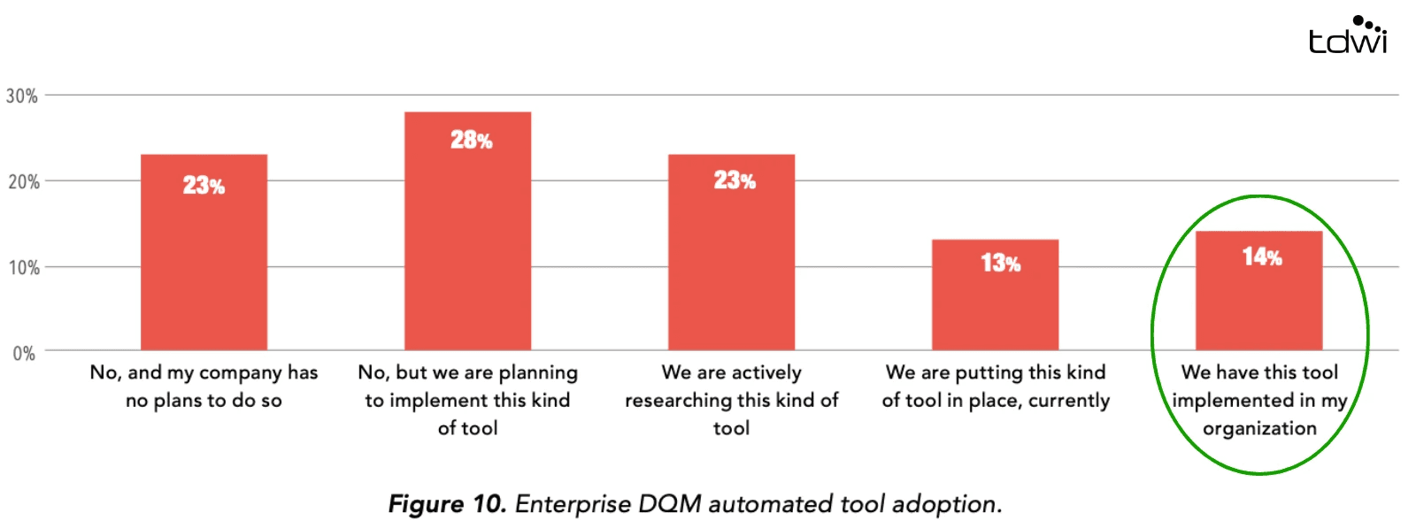 Data cleansing is the most manually intensive activity in data management. According to TDWI State of Data Quality report, only 14% of organizations have implemented operational tools that automate data quality management processes like profiling, matching, correction, and enhancement. The rest rely on data stewards to close the loop manually. The steward became the data janitor.