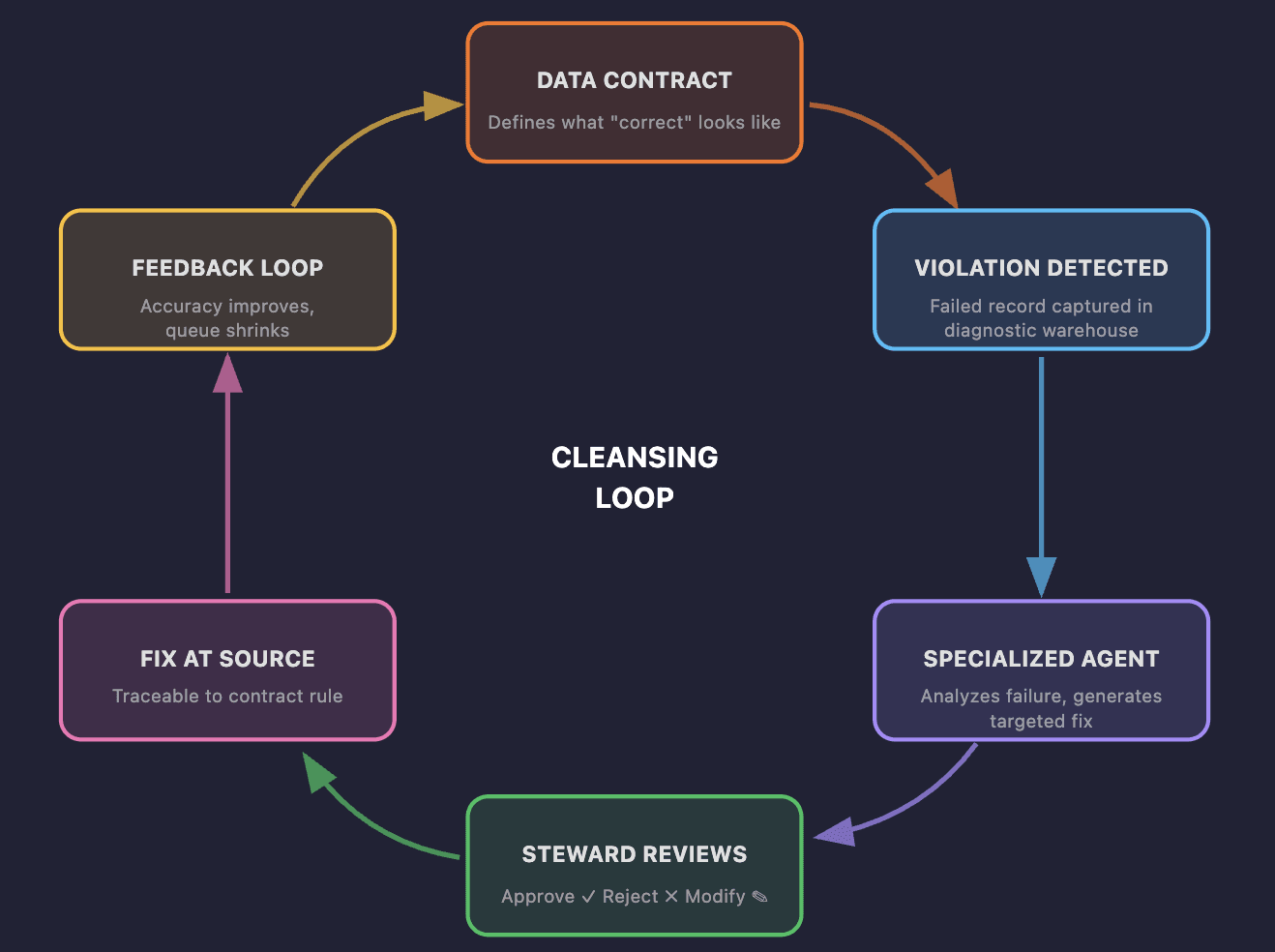 Agentic data cleansing changes that. It uses specialized AI agents that detect failures, analyze the source to find what "correct" looks like, propose a targeted fix, and wait for a human to accept. The steward governs. The agent does the janitorial work.