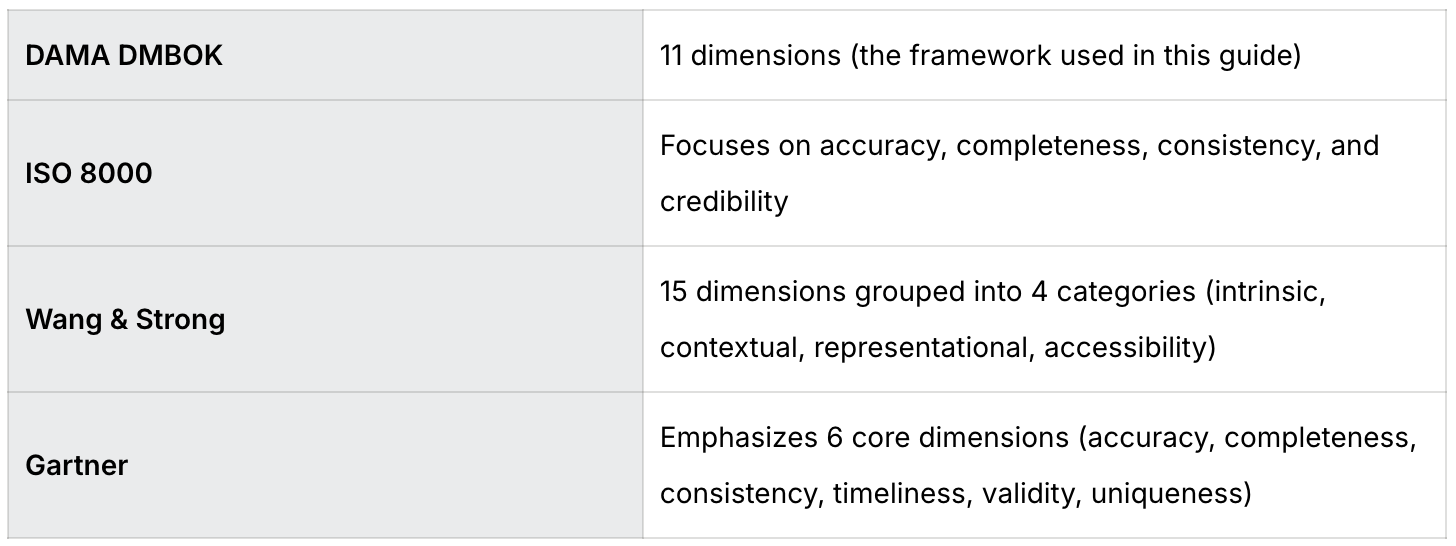 While there are many frameworks for categorizing data quality dimensions — including the DAMA Data Management Body of Knowledge, the ISO 8000 standard, Gartner's Data Quality Framework, and the Conceptual Framework of Data Quality (Wang and Strong 1996) — most converge on similar core concepts.
